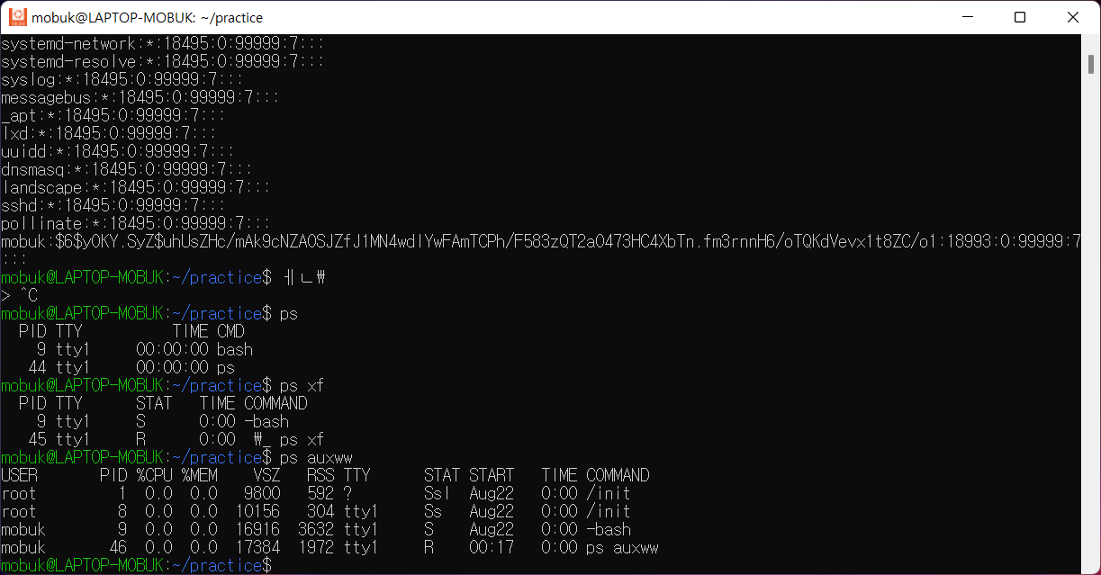 - aux : 모든 사용자의 프로세스를 상세하게 출력
