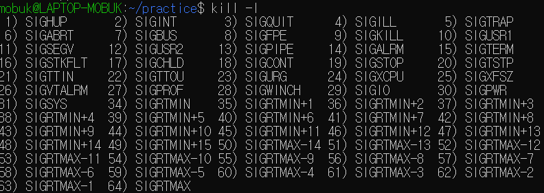 +) 사실 kill은 프로세스 종료 명령어가 아니라 시그널을 전송하는 명령어이다. 이때 시그널은 고유번호가 있고 아무 것도 지정하지 않으면 TERM(terminate, 종료) 시그널이 지정된다.