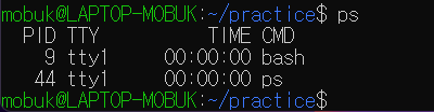 ps 명령어는 현재 시스템에서 실행 중인 프로세스의 목록을 출력한다. 아무런 인자 없이 ps를 사용하면 현재 접속한 터미널에서 실행한 프로세스만을 출력한다.