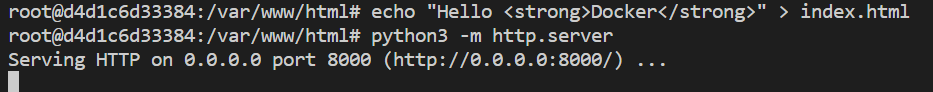 RUN echo "Hello <strong>Docker</strong>" > index.html