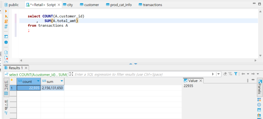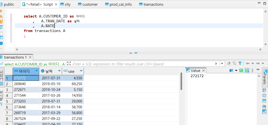 이렇게 사용하면 된다. 하지만, 이럴 경우 중복 데이터를 구분하지 않고 단순히 명령을 실행한다. 만약 customer_id 값을 중복 값을 제외하고 count하고 싶다고 하면 distinct를 붙여주면 된다.