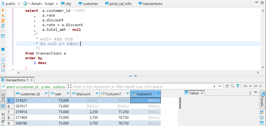 NULL은 데이터가 없는 상태로 공백과 구분되며, NULL과의 연산은 항상 NULL이라는 점 기억해두자.