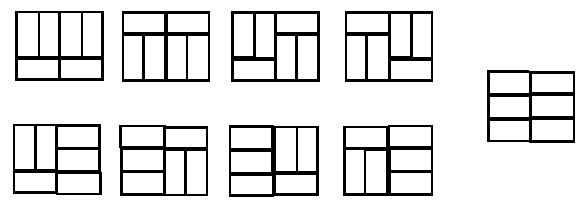 - n = 4 일때부터 갑자기 경우의 수가 많아진다. 기본적으론 n=2일 때의 조각들을 하나의 블럭처럼 생각하여 조합할 수 있다. 그럼 3x3 = 9이다. 이렇게 만든 조각은 아래와 같이 생겼다.