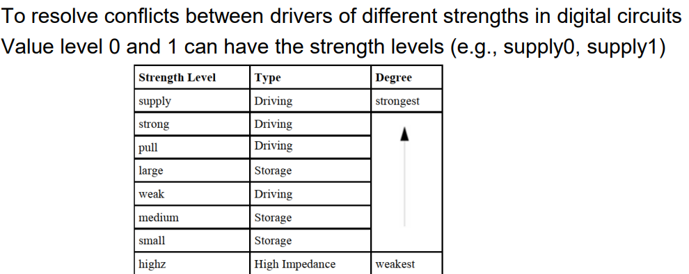 Strings a sequence of character that are enclosed by double quotes(””) “Hello verilog”