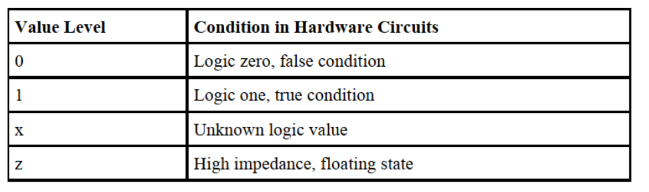 X or Z values X : unknown value ( 값이 존재하는데 모르는 것) 12’h13x : 0001 0011 xxxx ( x는 0과 1 아무거나 가능) Z : high impedance value ( 값이 없는 것 / HW : 선이 끊어진 것을 의미)