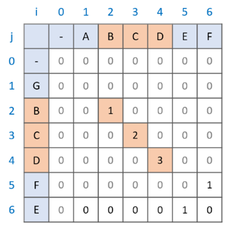두 문자가 같다면 [j-1][i-1]의 값에 +1을 하는 방식으로 위의 표를 채워나가면 된다.