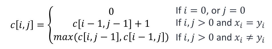 - x[i] != y[j] 이면 c[i][j] = max ( c[i-1][j], c[i][j-1] ) 이다. (왼쪽과 위의 최댓값)