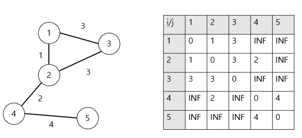 자기자신은 0, 이동할 수 없는 (연결되지 않은) 노드끼리는 INF 로 채운다.