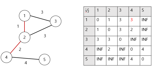 graph[1][2] + graph[2][4] = 1 + 2 = 3