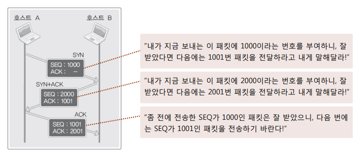 SYN : 클라이언트가 서버에게 SYN 메시지를 보낸다. 이 메시지에 포함된 시퀀스 번호는 임의의 값 A이다. (아래 그림에서는 1000을 의미한다.)